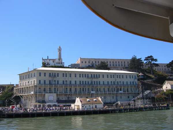 Mercredi 2 Aoùt : les déplacements en transports en commun, s'avérant un peu longs, nous partons en voiture pour Fisherman's Wharf, on peut trouver dans les rues adjacentes, des parkings à des prix interessants ( 8 USD pour la journée, au lieu de 20 USD en bord de mer !.) En attendant le départ de notre excusrion pour Alcatraz ( nous avions réservé par internet ), nous visitons le Pier 39 et ses abords, déception les phoques ont pratiquement disparu, à notre dernier voyage en 2003, plus de six cents se doraient au soleil au pied du Pier 39, aujourd'hui à peine une trentaine, que s'est il passé ? Nous embarquons au Pier 43 pour visiter Alcatraz. Traversée rapide... et nous voici dans ce lieu célébre (sinon prestigieux), ou tous les "plus mauvais sujets" des USA ont été enfermés, au départ prison militaire de 1909 à 1934 et pénitencier fédéral de 1934 à 1963...fermée par Robert Kennedy, ministre de la Justice, Al Capone est passé par là !! Visite très bien organisée, avec écouteurs dans la langue de son choix, le lieu est impressionnant, et les cellules sinistres, mais c'est cependant très instructif et représentatif du régime carcéral de l'époque, nos enfants et petits enfants, sont sortis un peu songeurs, nul doute, qu'ils s'en rappelleront. Au retour nous ne pouvons approcher du Golden Gate Bridge, dans le brouillard. Il faisait froid et il y avait du vent, à peine 15° ! Pour admirer ce chef d'oeuvre nous décidons d'y aller en voiture, et nous pouvons profiter de quelques éclaircies pour photographier. Nous empruntons le pont pour gagner Sausalito, une très belle banlieue de San Francisco, résidentielle et huppée à souhait ! une curiosité les "house-boats", résidences sur l'eau, coquettes et fleuries, elles ont été construites dans les années 1970 par les "hippies"... totalement illégales, elles se vendent parait-il à prix d'or ! malgré leur état de ruine pour certaines. Après une rapide incursion sur la route côtière du "Golden Gate récreation area", hélas dans la brume, nous repassons le pont ( payant 5 USD dans ce sens seulement! ) et nous nous rendons dans le centre de San Francisco, au Square Alamo, où se trouvent le quartier des "Painted Ladies", charmantes maisons de style victorien. Nous les avons trouvées un peu trop rénovées et moins colorées qu'en 2003, et la maison, où fut tourné le film "Mme Doubtfire" toute proche est retombée dans l'anonymat d'un revêtement fade. Ce quartier reste néanmoins très agréable avec son caractère aristocratique ! Nous rentrons à la nuit un peu fatigués, mais enchantés de notre journée. Ce fut notre troisième séjour à San Francisco, et nous apprècions de plus en plus cette ville magnifique, nos enfants et nos amis, venus pour la première fois : sont emballés et décident de faire une visite nocturne en voiture, pour clore notre bref séjour... Pour eux c'est définitif : ils reviendront !