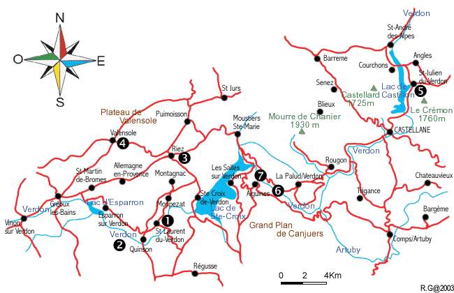 l'élastique brrr...!!). "Falaise des Cavaliers", "col d'Illoire", ne pas manquer la visite du pittoresque village d'Aiguines et son chateau, avec vue sur le magnifique lac de "Sainte Croix". La route Nord (rive droite) et sa variante par la D23 et le chalet de la "Maline", offre une succession de belvédères (: "Trescaire", "Escales", "dent d'Aires") et de parois vertigineuses, paradis de l'escalade et des "varappeurs". Pour les courageux, Un sentier, le "sentier Martel" circule au fond des gorges, on peut l'emprunter au chalet de la "Maline", à la "Falaise des Cavaliers" et au "Belvédère du couloir Samson".