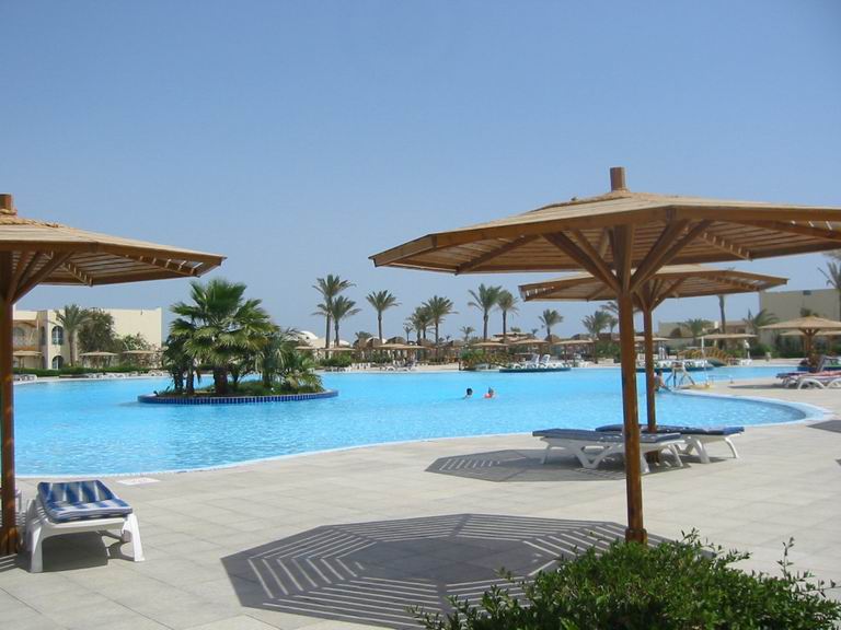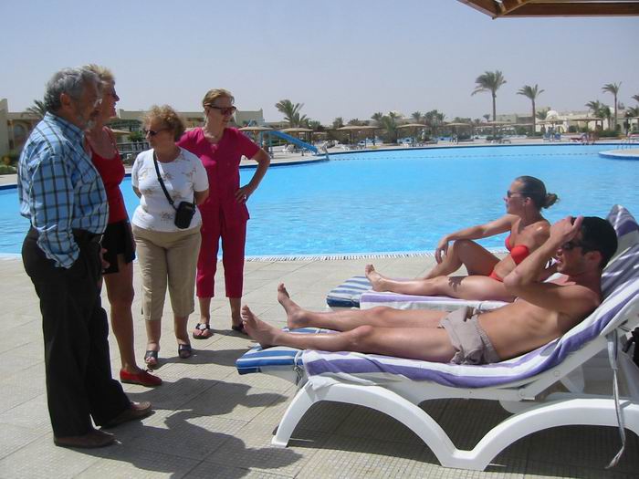 - Le 9 Avril - Nous quittons le « navire » à 7H30 ? Adieux à Ahmed (dont nous conserverons un excellent souvenir), nous partons vers la mer Rouge en bus et en convoi, depart du convoi vers 09H00, l’anarchie s’installe aussitôt, une cinquantaine de cars escortés par la police, font la course, dépassant à droite, à gauche, pour foncer et arriver les premiers aux goulots d’étranglement que sont les contrôles policiers (tous les 25kms environ, poste de police, avec blockaus et miradors) notre chauffeur particulièrement téméraire nous améne rapidement en tête ! nous roulons durant 1H30, dans une zone verdoyante, émaillée de cultures diverses, cannes à sucre, luzerne, céréales…puis nous pénétrons dans une zone désertique, montagneuse, nous faisons escale sur une « aire de repos », très typique, les chameaux circulant au milieu des voyageurs ! Arrivée à Hurghada vers 12H00, ville balnéaire en pleine expansion, les grandes chaînes d’hôtel sont toutes représentées, avec des implantations vastes et luxueuses. Notre hôtel le « Désert Rose », est superbe, loin d’être un des plus grands, il dispose d’espaces verts impressionnants, et de trois immenses piscines, Accès direct sur une plage privée, . Nous disposons d’une chambre confortable, avec balcon et vue sur la mer, et luxe suprême, la télé avec TV5 en français ! Plusieurs salles à manger et un buffet géant, varié et bon ! nous accueillent…ensuite repos télé, avec le « mariage du prince Charles » au programme ! le top ! ensuite repos chaise longue dans les jardins, au bord de la piscine ! - Le 10 Avril – Ce Dimanche est consacré au repos, promenade dans les jardins et visite de l’hôtel. Notre guide est très discrète, nous la voyons seulement tous les midis, pour faire le point ! Les magasins sont fermés, mais nous pouvons accéder au distributeur d’argent. Nous resterons nous reposer au bord de la piscine, nos amis sont partis en Safari 4X4 dans le désert, avec visite d’un village bédouin et repas local, tout ceci s’avère un peu décevant, Les bédouins ne participent que très peu à ces activités, un peu trop « touristiques » ! - le 11 Avril - Journée libre, nous en profitons pour sortir de l’hôtel et visiter les magasins environnants, consacrés exclusivement aux souvenirs et à l’artisanat égyptien, de très belles boutiques, où les tentations ne manquent pas…nous nous sommes laissés tenter ! un petit passage au cybercafé pour envoyer quelques « mails » . Notre journée libre, comporte tout de même une activité : sortie en mer, avec un bateau à fond de verre : deux heures très agréables, au large d’Hurghada, nous pouvons admirer les fonds marins de la mer Rouge, quelques poissons colorés et surtout de très nombreuses méduses. Le reste de la soirée est consacré à préparer les bagages, car nous partons très tôt !! - Le 12 Avril – Lever à « 00H00 », départ à 2H00 en convoi (munis de paniers repas) Nous longeons la côte en direction de Suez, escorte policière, bien entendu ! et excellente route, (comme toutes celles que nous avons empruntées jusqu’ici…) . Il n’empêche que notre car doit s’arrêter, immobilisé par une fuite grave ! Mais tout est prévu, les policiers s’arretent auprès de nous, dans le convoi un car vide est disponible et nous accueille, après le transfert de nos bagages. La route continue, la mer Rouge à droite et le désert à gauche, quelques installations pétrolières, et une forêt d’éoliennes, plantée en plein désert ? Nous nous arrêtons à Suez, à l’entrée du canal pour quelques photos, trafic peu important, un pilote prend en charge, chaque bateau empruntant le canal.. Finalement nous arrivons au Caire (après 650 Kms de route) vers 11H30, ville tentaculaire (18 Millions d’habitants), voile jaunâtre de pollution au dessus de la ville, circulation démentielle avec force klaxons, le premier aspect est peu encourageant, les quartiers périphériques sont assez chaotiques, avec un aspect de « non fini » ! Mais nous verrons par la suite que le centre ville n’a rien à envier à nos cités . Nous prenons notre déjeuner dans un restaurant agréable, mais la nourriture est médiocre ! Et nous rejoignons ensuite notre hôtel, car un repos s’impose ! « Hôtel Cataracts », bon standing, un peu suranné, mais notre chambre est confortable et tout fonctionne bien, c’est l’essentiel. Le buffet de l’hôtel est correct, une fois restaurés, nous ne tardons pas à dormir ! |