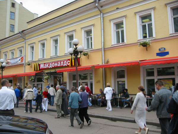 la rue Arbat, (le cœur de Moscou), rue piétonne, grosse affluence, nombreuses boutiques, échopes de souvenirs, cafés, restaurants (dont le fameux Macdonald), peintres en plein air, marchands ambulants, notamment un curieux vendeur de coca, qui porte une glacière