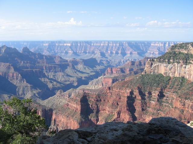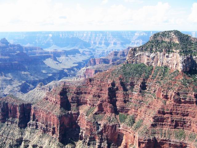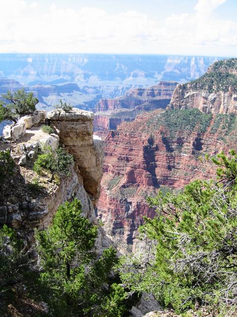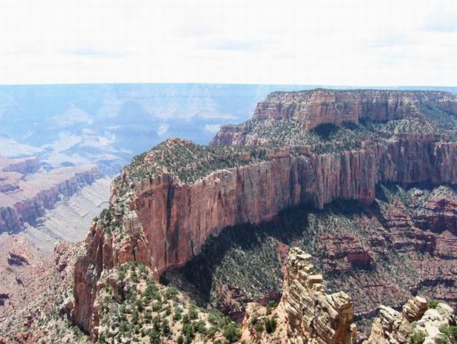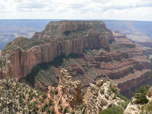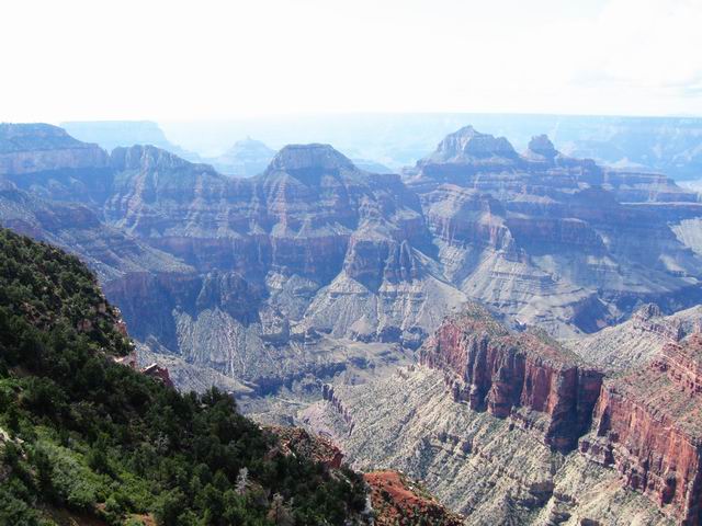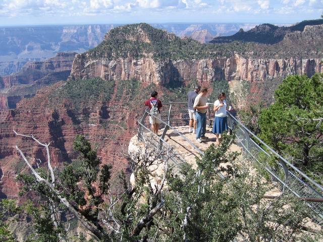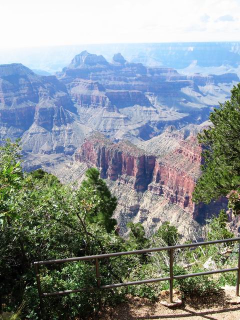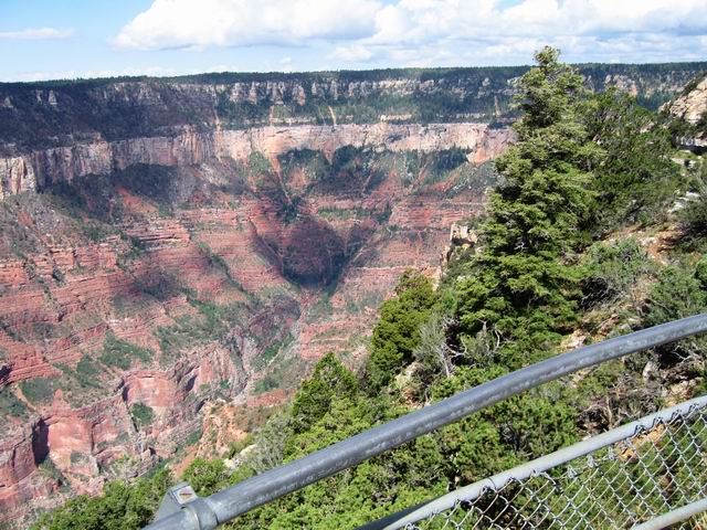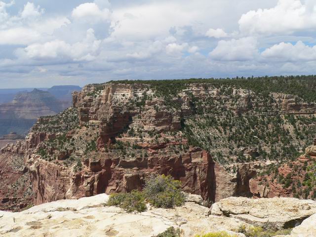 Mercredi 16 Aoùt : Nous avons bien l'intention de profiter jusqu'au bout de ce séjour à North Rim, nous disposons de la matinée, pas suffisant pour faire le sentier qui descend au Colorado, car il faut plus d'une journée, et 22 kms pour rejoindre le fleuve, qui coule 1800 mètres plus bas, et remonter ensuite. Il faut trois jours et 34kms pour rejoindre la rive Sud... Tout est colossal, nous nous contenterons des points de vues ! Après un solide breakfast pris au Lodge nous quittons nos sympathiques maisonnettes pour rejoindre le superbe panorama d'Angel Point, que nous n'avons pu explorer à notre gré hier, suite à l'orage. Il ne faut pas craindre les distances, 60kms aller et retour pour ce point de vue, qui s'avère "royal", effectivement c'est le nom donné à la pointe la plus avancée, "Cap Royal" , les mots nous manquent pour qualifier les splendeurs que nous découvrons, le gouffre de 1800m, et le Colorado qui ressemble à un filet d'eau, au loin la rive sud dans le flou ( South Rim ), partout des falaises à dominante ocre et rouge, très peu de végétation, et encore nous sommes sur la rive nord, la plus boisée, la rive sud vue de loin est absolument lunaire !!
