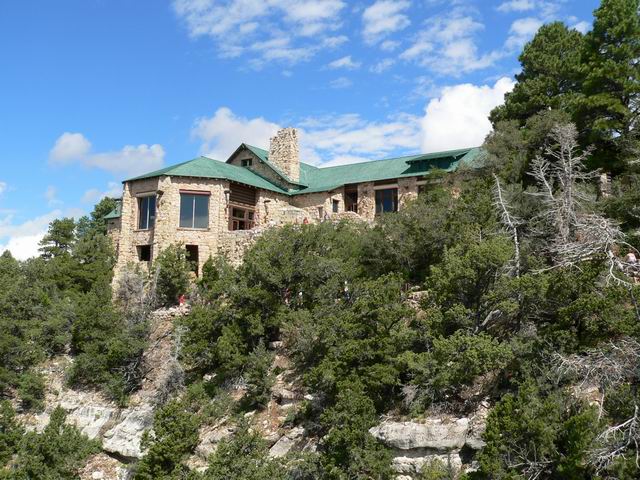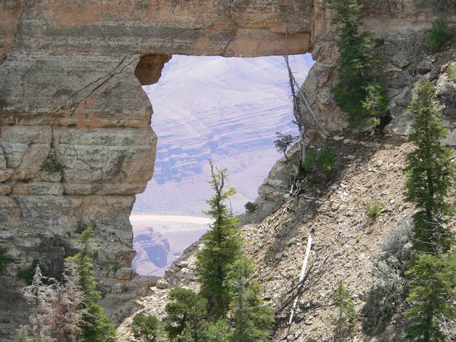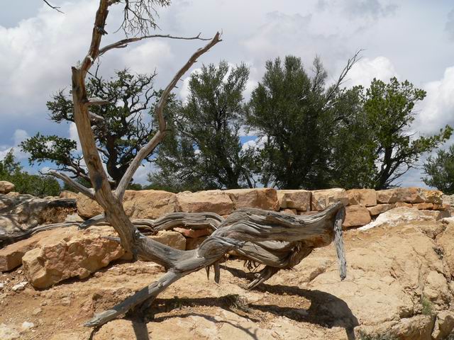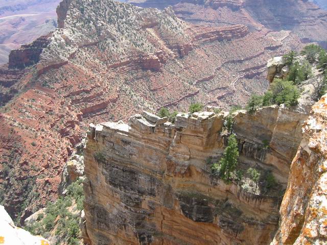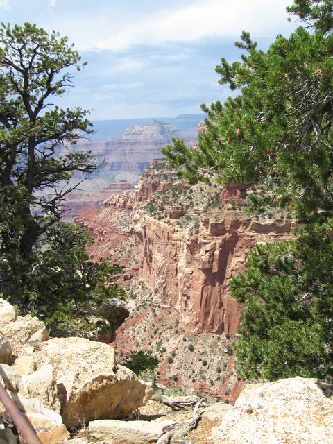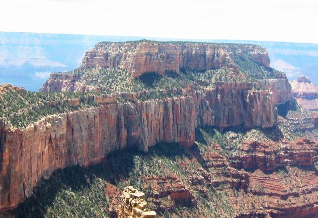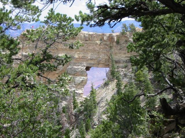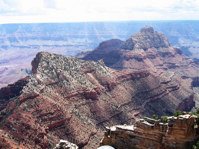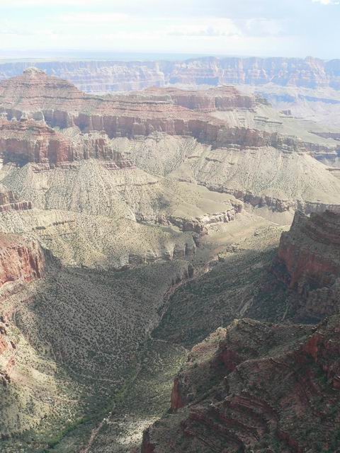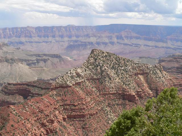 Mercredi 16 Aoùt : Nous avons bien l'intention de profiter jusqu'au bout de ce séjour à North Rim, nous disposons de la matinée, pas suffisant pour faire le sentier qui descend au Colorado, car il faut plus d'une journée, et 22 kms pour rejoindre le fleuve, qui coule 1800 mètres plus bas, et remonter ensuite. Il faut trois jours et 34kms pour rejoindre la rive Sud... Tout est colossal, nous nous contenterons des points de vues ! Après un solide breakfast pris au Lodge nous quittons nos sympathiques maisonnettes pour rejoindre le superbe panorama d'Angel Point, que nous n'avons pu explorer à notre gré hier, suite à l'orage. Il ne faut pas craindre les distances, 60kms aller et retour pour ce point de vue, qui s'avère "royal", effectivement c'est le nom donné à la pointe la plus avancée, "Cap Royal" , les mots nous manquent pour qualifier les splendeurs que nous découvrons, le gouffre de 1800m, et le Colorado qui ressemble à un filet d'eau, au loin la rive sud dans le flou ( South Rim ), partout des falaises à dominante ocre et rouge, très peu de végétation, et encore nous sommes sur la rive nord, la plus boisée, la rive sud vue de loin est absolument lunaire !!