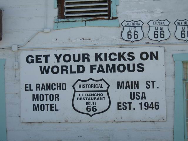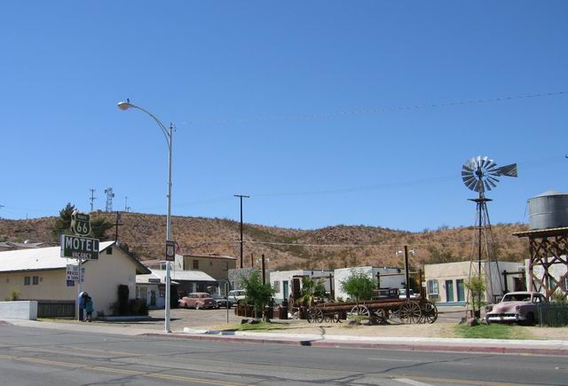Il fait déjà très chaud, 37°, nous reprenons notre route, en contournant Las Vegas, par le Sud, nous pouvons jeter un dernier regard sur les hôtels prestigieux qui se profilent à l'horizon ! Nous nous dirigeons vers Los Angeles, par l'autoroute 15S, qui traverse le désert de Mojave, nature particulièrement dénudée et sauvage, cependant des casinos fleurissent çà et là, au niveau de la frontière Utah/Californie, dans ce désert. Nous atteignons Barstow à l'heure du déjeuner, et là par hasard nous découvrons la "route 66" qui passait effectivement à Barstow, cette route mythique, abandonnée depuis les années 80, a été morcelée, débaptisée et transformée en autoroute en de nombreux endroits des USA, elle va de Chicago à Los Angeles, nous avons pu la croiser ici, où de nombreux souvenirs subsistent, motels de l'époque, panneaux, et même un musée... c'est assez émouvant de retrouver ces traces d'un passé pourtant assez proche, mais presque effacé... Mais, le temps presse ! on nous a recommandé de ne pas manquer d'aller faire des emplettes dans de super "magasins d'usine", les "Outlets", situés à Barstow, la recherche fut longue et difficile, et les explications des gens du cru, nous renvoyant dans tous les azimuts, ne nous ont guère facilité la tâche... nous pensions abandonner pour finalement trouver les Outlets aux bords de la route 15S en repartant !! imaginez d'immenses entrepôts, où toutes les grandes marques de vêtements, de chaussures, d'articles de sports, de voyage etc etc.. sont représentées ! il faut prendre la voiture pour aller d'un entrepôt à l'autre !! les prix, attrayants certes, compte tenu de la dévaluation du dollar par rapport à l'Euro, mais pas révolutionnaires ! Les dames et les enfants de notre groupe, furent pris d'une frénésie pratiquement "incontrôlable", tout acheter, impossible !! enfin tout voir, tout comparer !! nous avons passé là, plusieurs heures, de loin les plus fatigantes de notre voyage, mais nous avons eu l'impression de faire de bonnes affaires ! et nous sommes repartis en fin de soirée vers Los Angeles, très en retard sur notre horaire, mais qu'importe, il faut se faire plaisir quelquefois !! un conseil toutefois, aux éventuels acheteurs, bien vérifier l'article, des imperfections peuvent exister !