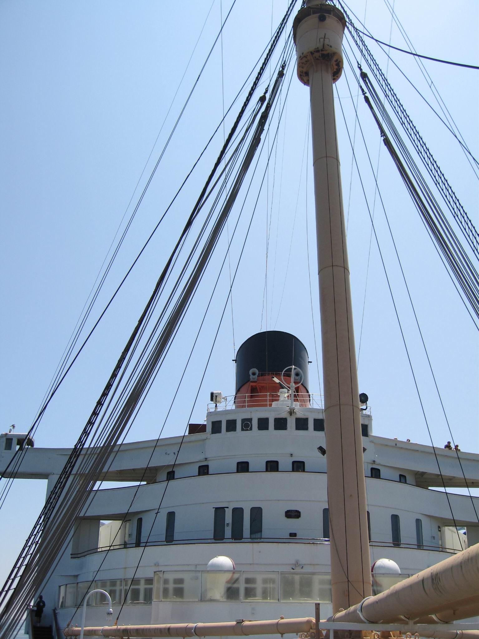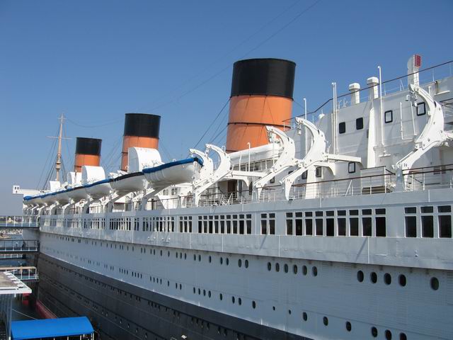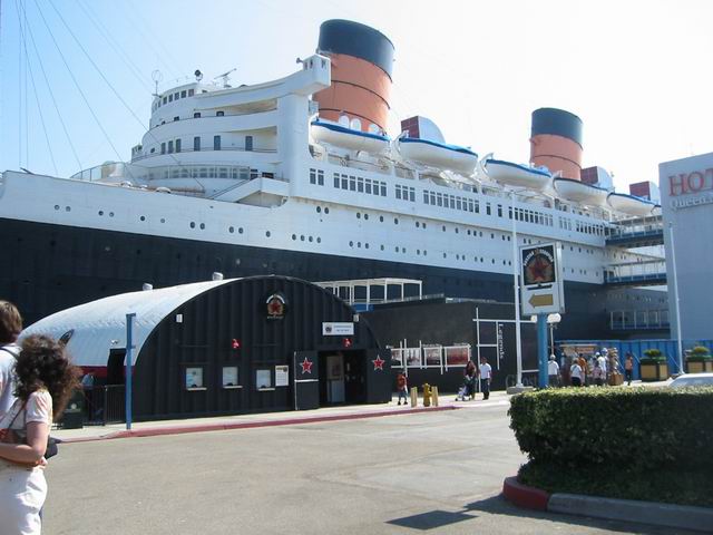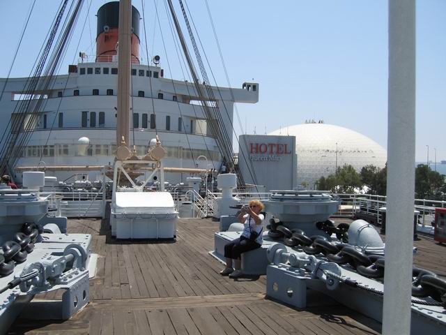 Samedi 19 Aoùt : Aujourd'hui , le groupe va se scinder en deux, Françoise, Xavier et leurs enfants se dirigeront vers les "Universal Studios", à Hollywood, que nous connaissons déjà, nous accompagnerons donc Françoise et Kamal, ainsi que leurs enfants à Long Beach, où se trouve amarré, le vieux "Queen Mary" paquebot mythique construit avant la guerre 39/45, transformé en hôtel, on peut le visiter ! Le parc des "Universal Studios" est une magnifique vitrine pour le cinéma hollywodien, on circule au milieu des attractions, des démonstrations de catastrophes, feux, inondations, éruptions, les trucages sont démystifiés et expliqués, les différents décors sont exposés, et des sketches se déroulent sans discontinuer, devant une foule ravie! c'est évidemment un régal pour les enfants, et les notres sont revenus enthousiasmés. Pour notre part, nous avons pris la route de Long Beach, pour la visite de notre paquebot ! nous avons préféré celà à la visite du centre de Los Angelés ( Downtown ) amoncellement de gratte-ciels et de commerces, avec une densité de circulation sans intérêt pour nous, qui disposons de peu de temps ! en utilisant les Freeways nous sommes à Long Beach, dans la demi heure qui suit. Le Queen Mary est là imposant, amarré à son quai, il semble prêt à partir! C'était le fleuron de la flotte commerciale britannique, avant la dernière guerre, rival de notre "Normandie", ils s'affrontaient à chaque traversée de l'Atlantique Nord, détenant à tour de rôle le "ruban bleu" de la rapidité de traversée. transport de troupes durant la guerre il est toujours équipé de plusieurs tourelles de deux canons de défense anti-aérienne, mis à la retraite en 1967, il a appartenu à Walt Disney qui l'a revendu à la ville de Long Beach, où il fait office d'hôtel de luxe ! Nous avons pu visiter la salle des machines, avec l'odeur et le bruit adéquat ! Nous n'avons pu évidemment visiter les cabines transformées en chambres d'hôtel, non plus les salles à manger et cuisines qui sont toujours en fonction. Par contre nous avons pu déambuler sur tous les ponts, et les superstructures, en particulier la passerelle de commandement. Nous avons eu l'impression un moment d'être en croisière ! aussi c'est à regret que nous avons quitté ce magnifique navire. Pour terminer la journée, nous avons amené les enfants de nos amis à la plage de Venice Beach, le lieu est toujours très fréquenté, comme lors de notre dernière visite, beaucoup d'activités sportives, beaucoup d'exhibitions en, roller, vélo, volley, tennis, musculation etc.. plein de petits commerces, mais certains d'un niveau discutable, trafic en tout genre, les revendeurs ne se gênent en rien, pour vous proposer n'importe quoi ! au milieu de toute cette foule, de nombreux peintres et saltimbanques se produisent en plein air et apportent une note de gaîté ! tout celà est complétement délirant, mais c'est à voir !! De retour, nous échangeons nos impressions, Universal studios, Queen Mary, Venice, chacun à bien profité de sa journée c'est l'essentiel !