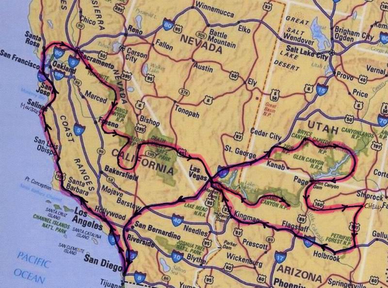 cow-boy !) suivie de la visite d'Hollywood, Santa Monica Bd, le célèbre "théatre chinois", avec les empreintes des mains et pieds des stars dans le