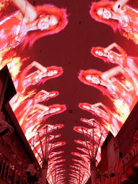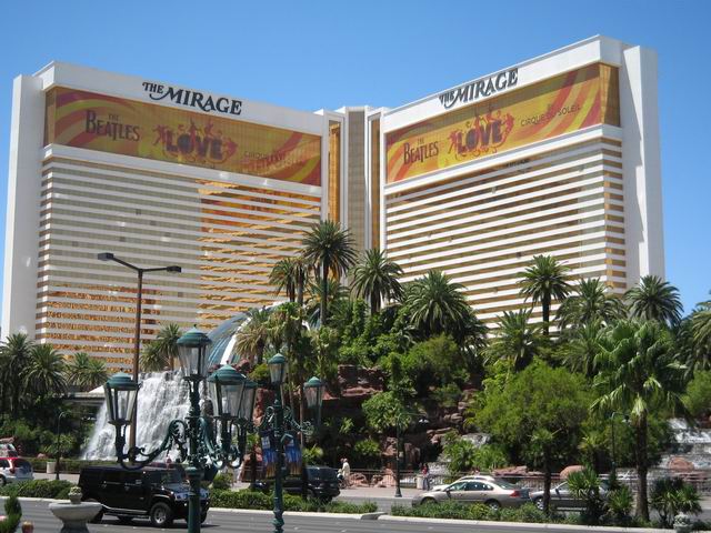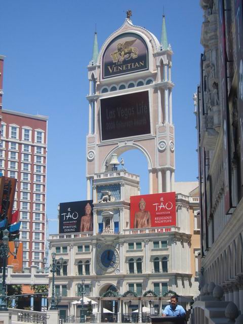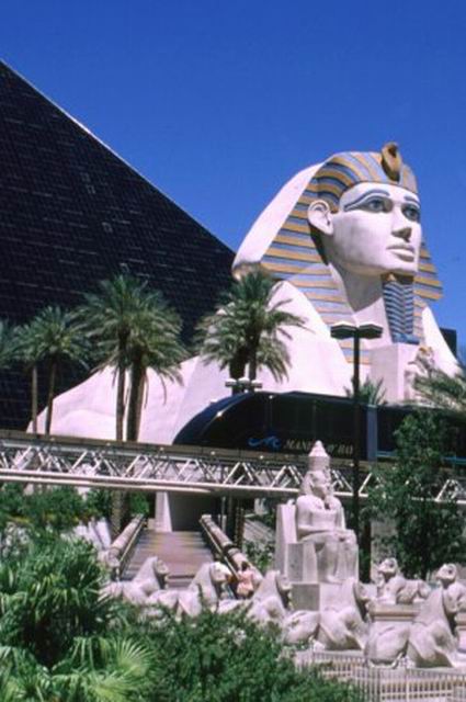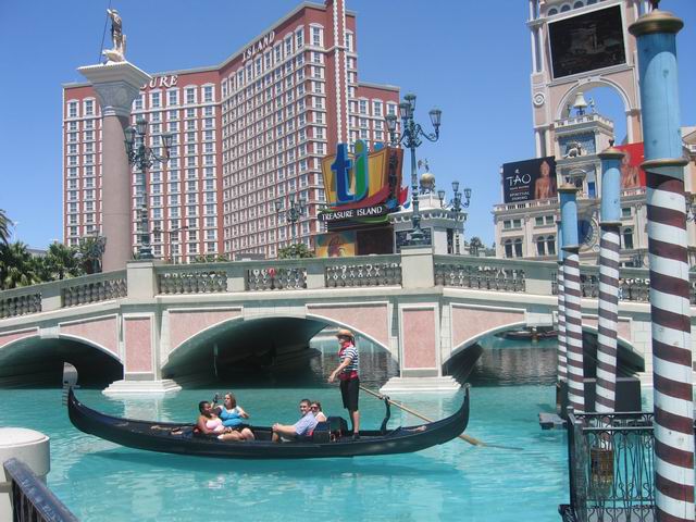 Lundi 7 Aoùt : nous prenons le breakfast à l'hôtel, très correct ( 8 USD) compte tenu du choix offert au "buffet"! Et nous reprenons notre visite, nous avons choisi le déplacement en voiture et nous utilisons le parking de l'hotel le plus prestigieux : "le Vénitian", nous sommes sur place, mais compte tenu du gigantisme des hôtels, il nous faut arpenter de nombreux couloirs, avant d'arriver à la galerie commerciale et au Casino, cet hôtel est une vraie merveille, copie conforme de tous les monuments de Venise, il y a même des canaux, avec des gondoles ! Nous sortons pour marcher sur le Strip, et admirer au passage, l'hôtel "Treasure Island", avec son vieux bateau pris d'assaut par les pirates.. le "Mirage" avec ses palmiers et son volcan qui entre en éruption ! Nous connaissons bien, y ayant séjourné il y a 7ans déjà ! le Caesars Palace l'un des plus prestigieux, attire notre attention, avec son Casino géant, sa galerie commerciale somptueuse avec son ciel étoilé et ses statues animées ! nous sommes en pleine "Rome antique" , partout des statues de marbre, c'est aussi ici que se trouve le "Colosseum" scène très connue ou se produit "Céline Dion" ! tout à côté, toujours l'Italie ! avec le "Bellagio", et ses superbes jeux d'eaux, en face "le Paris", on ne peut pas le louper, avec sa "Tour Eiffel" de 150m de haut ! , l'Arc de Triomple, l'Opéra... on s'y croirait ! Circuler dans les rues par cette chaleur, est un peu pénible, mais tous les intérieurs sont super-climatisés, et dehos on nous rafraichit avec des brumatiseurs,nous avons même vue une rue ventilée, incroyable ! quelle débauche d'énergie ... après quelques rafraîchissements au MacDo du coin, nous avons hâte de rentrer prendre un peu de repos, vivre dans cette ambiance trépidante est usant ! Nos enfants infatigables repartent pour Frémont-Street, où se déroule chaque soir un extraordinaire spectacle d'images sur fibres optiques, dont la voute de la rue est garnie à 30m de haut sur 300m de long .. nous avons assisté à ce spectacle en 2003, malheureusement ce soir le grand show n'a pas eu lieu ! juste une petite démonstration, nos enfants ont du se contenter du volcan de l'hôtel Mirage ! ils ont aussi visité le magnifique Louxor, MGM et NewYork-NewYork... (que nous connaissions déjà) quelle journée !