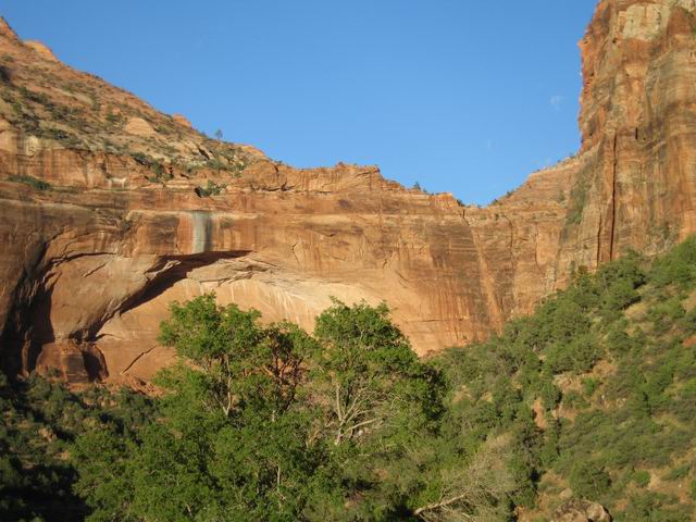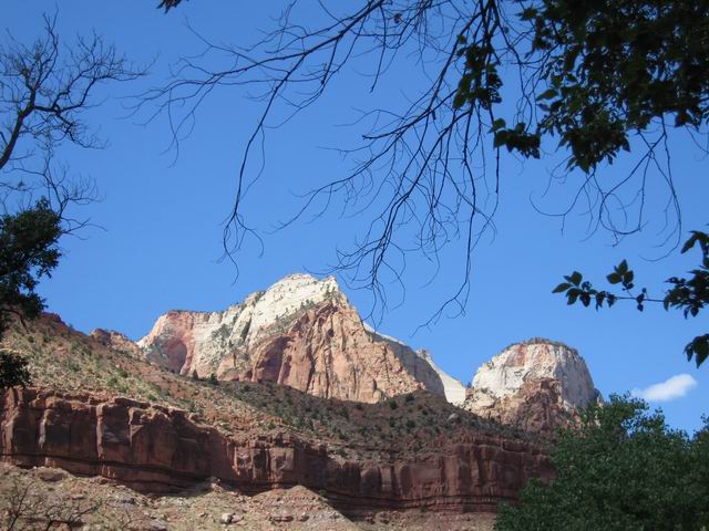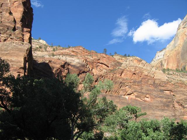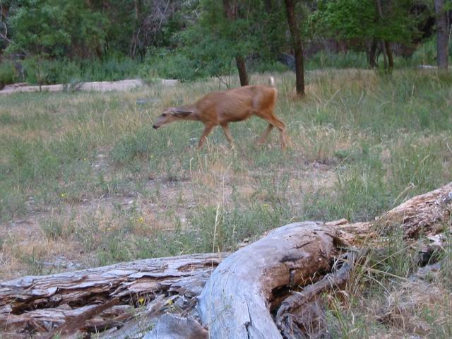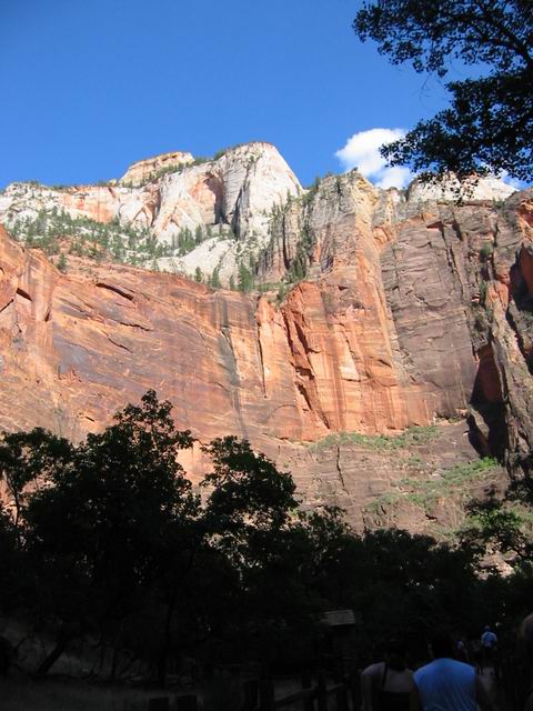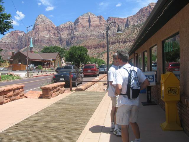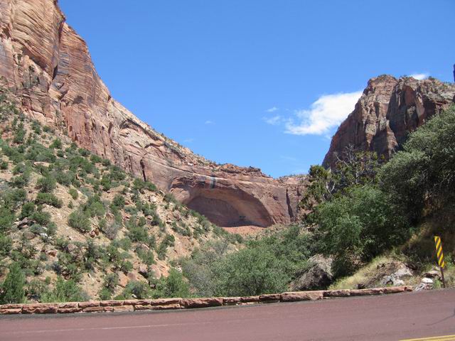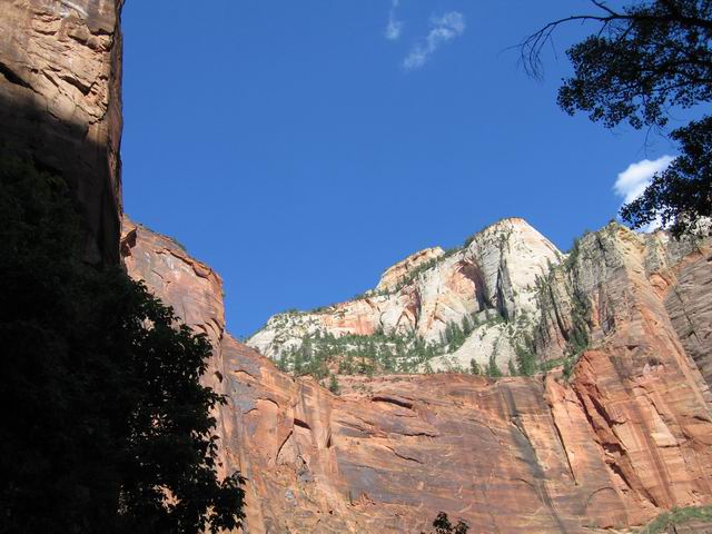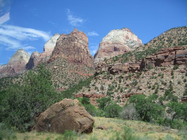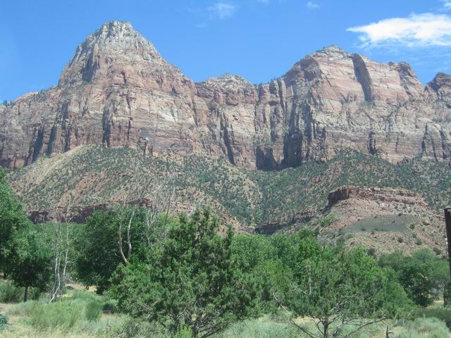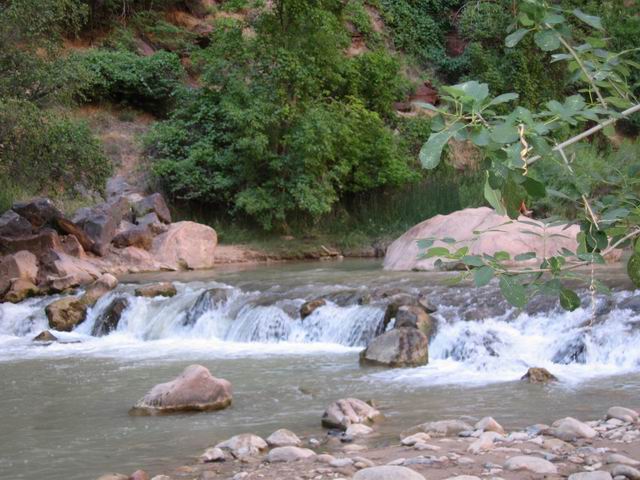 Mercredi 9 Aoùt : Nous quittons Las Vegas, avec un brin de regret, car pour une ville extraordinaire, c'est vraiment une ville extraordinaire !! Cap à l'Est par la Freeway 15N, direction l'Utah, la ville de St-George d'abord, et le parc national de Zion Canyon.. Parcours sans problème, assez accidenté lors de notre entrée dans l'Utah, après une brève incursion en Arizona. Petite halte à St-George pour faire le plein de carburant, au passage nous pouvons apercevoir le temple, car nous sommes au pays des Mormons, nous poursuivons ensuite par la route 9, jusqu'à Springdale, porte du Zion Canyon, élégante petite ville dédiée au tourisme, une bonne épicerie pour les provisions, et une banque pour se procurer quelques dollars ! tout ce qu'il nous faut pour continuer notre route ! Petite visite au "visitor center" pour notre information, nous devons laisser les voitures au parking, seules les bus navettes (shuttles) sont autorisés et c'est parfait ainsi ! De suite nous sommes pris par le beauté de ce parc, les falaises de grès rouges, les forêts verdoyantes et la "Virgin river" composent des paysages agréables et reposants. De superbes sentiers remarquablement aménagés incitent à la promenade, nous allons au terminus du bus et commençons la randonnée vers Zion Canyon Narrows, en longeant la Virgin River, nous rencontrons de nombreux petits animaux, tels qu'écureuils ou biches qui paissent tranquillement au bord de la rivière, plus loin le canyon devient tellement étroit, que le sentier disparait, il faut marcher dans le lit de la rivière, très impressionnant car les parois hautes de 300 mètres se rétrécissent à moins de dix mètres de large, hélas le temps a manqué pour poursuivre cette belle randonnée.