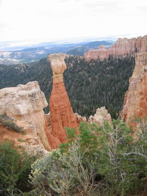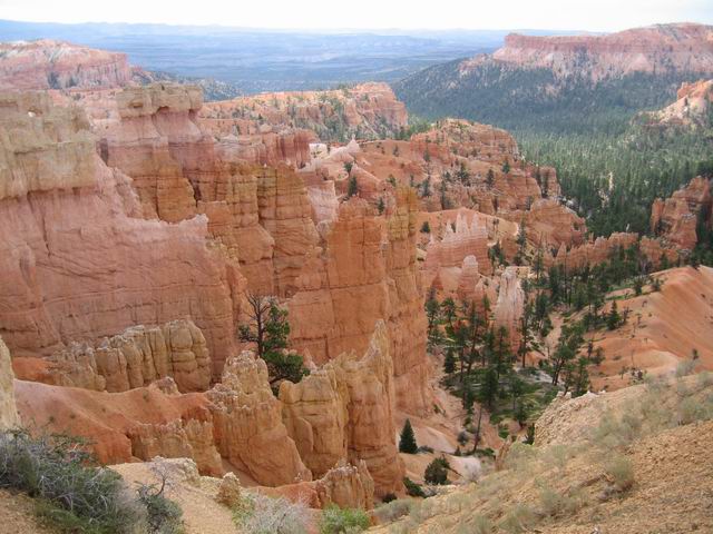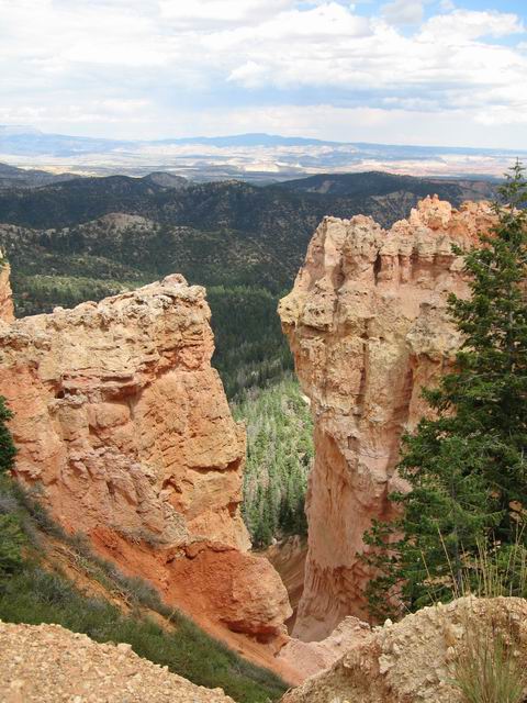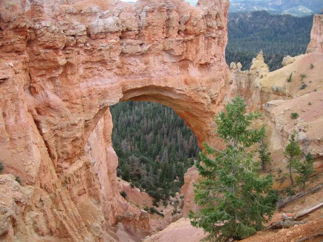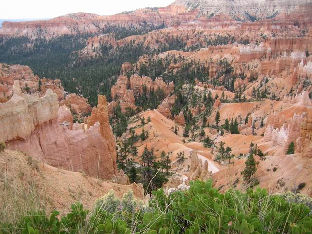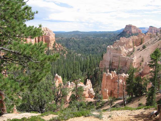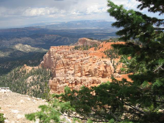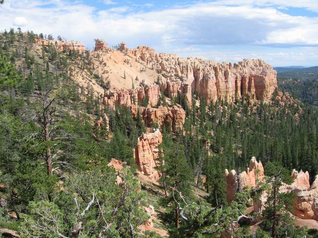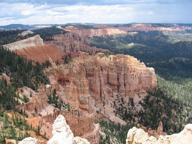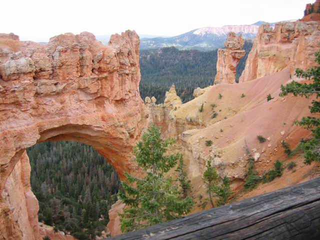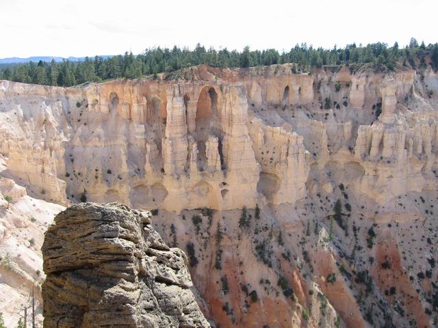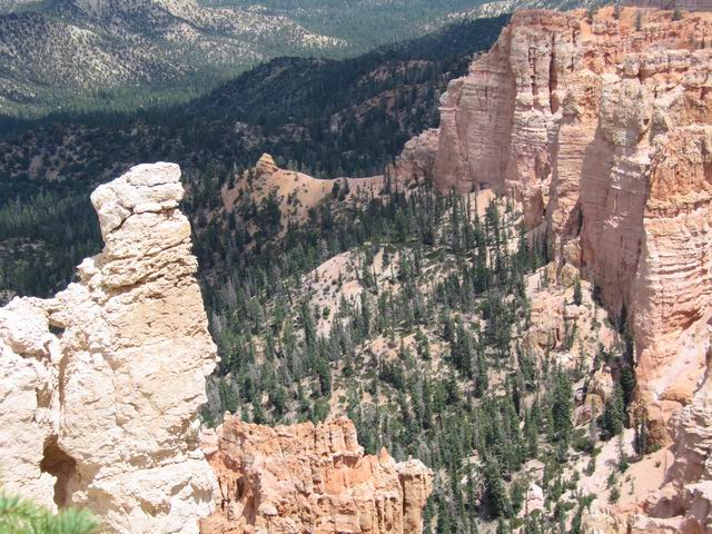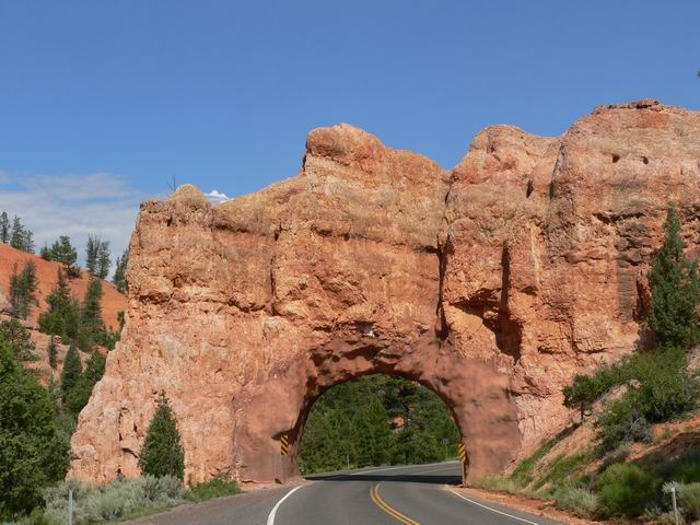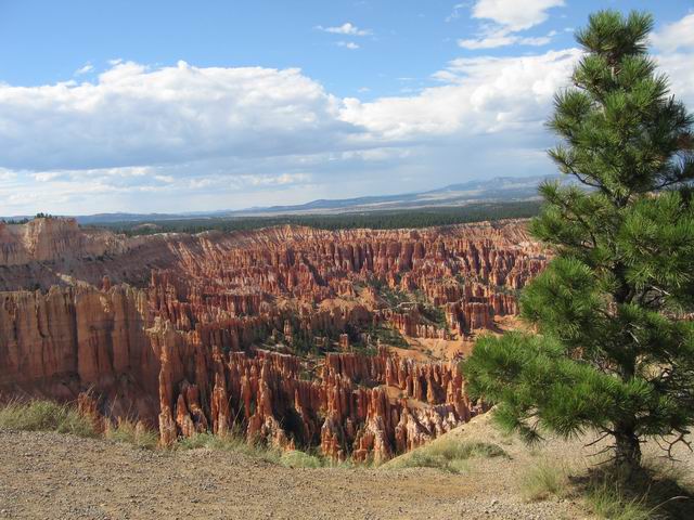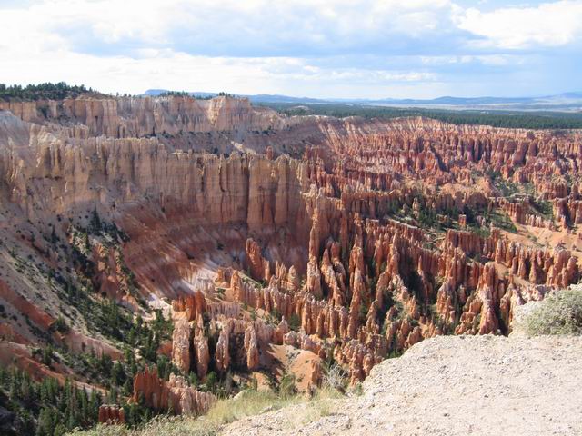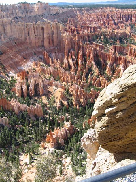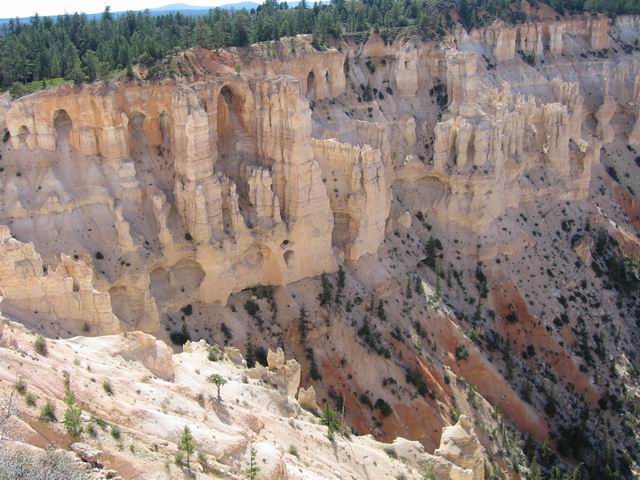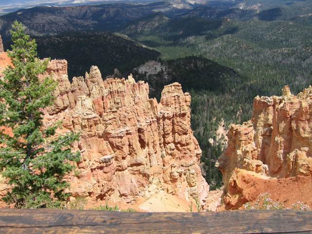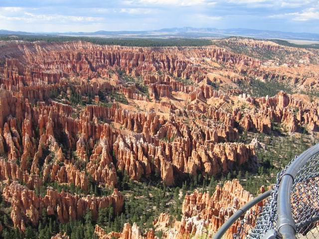 Jeudi 10 Aoùt : Après une nuit de repos, nous avons même pu accéder sur Internet, grâce à un PC aimablement mis à disposition par l'hôtel ! Breakfast au restaurant , et nous partons pour Bryce Canyon par la 89N ! Route très agréable, temps magnifique 25°, le Red Canyon ouvre la porte au Bryce Canyon, moins spectaculaire que ce dernier, il offre néanmoins une belle variété de roches rouges, et de ponts naturels au dessus de la route, un "visitor center" accueille les visiteurs de cet endroit un peu plus tranquille que Bryce ! de superbes pistes pour les vélos sont aménagées, des ranchs offrent des promenades équestres, un lieu en plein développement. Laissant sur notre gauche, la ville de Panguich, escale de nos deux nuits prochaines, nous nous dirigeons directement vers Bryce par la 12S, arrêt pour les provisions et l'essence à l'hôtel BW Ruby inn, bien situé à l'entrée du parc, on peut aussi y faire emplette de multiples souvenirs, malheureusement nous n'avons pu obtenir cet hôtel, trop sollicité à cette époque. Nous poursuivons vers Bryce Canyon,, et allons directement à l'extrémité Nord du parc, au point le plus élevé 2800m, et après un rapide pique nique dans un cadre fabuleux, nous revenons vers l'entrée sud, en nous arrêtant à chaque point de vue, on ne peut relater, le spectacle qui se déroule devant nous, tellement c'est beau, nous venons ici pour la troisième fois et nous ne sommes pas blasés ! Pour se rendre compte, il faut venir sur place, les photos que nos photographes prennent à un rythme soutenu, donnent une bonne idée du décor, mais rien ne vaut une visite ! En fait Bryce n'est pas vraiment un canyon, mais un amphithéatre, où s'étale une dentelle de rochers, allant du rouge au blanc en passant par toutes les variétés d'ocre ! ces roches sculptées par l'érosion, le gel et le vent forment des cheminées, des candélabres, des ponts, et toutes sortes de formes tourmentées, que l'on appelle les "Hoodoos" ! après une dizaine de points de vues, nous arrivons au point sublime Bryce Point", et nos amis et nos enfants décident de faire une grande randonnée demain, au milieu de ces hoodoos, au coeur du parc.. randonnée, que nous avons effectué lors de notre dernier voyage en 1999 ( et que nous leur recommandons chaudement ! ); Eblouis par ce spectacle, nous prenons le chemin de l'hôtel à une vingtaine de kms, à Panguich : un Best western , très correct, avec piscine lui aussi...